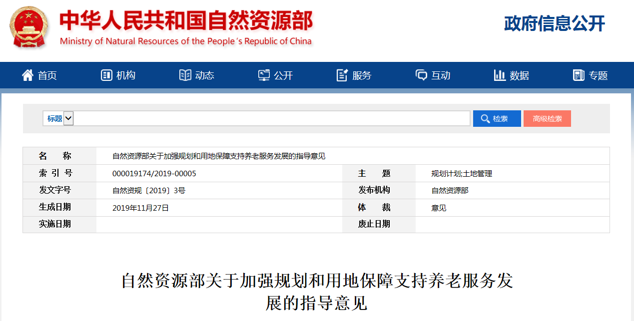 导读:近日自然资源部发布关于加强规划和用地保障支持养老服务发展的指导意见,明确了养老服务实施用地的范围、土地用途和年期、规划统筹、供地、监管等内容,为下一步国土空间规划编制及供地管理提出了要求。